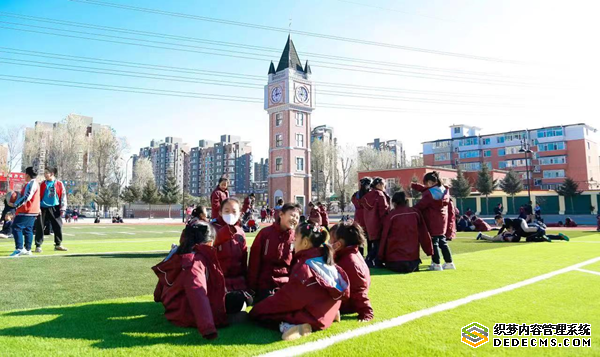 图为:长春市通达小学课间休息小学生在草坪操场上小聚