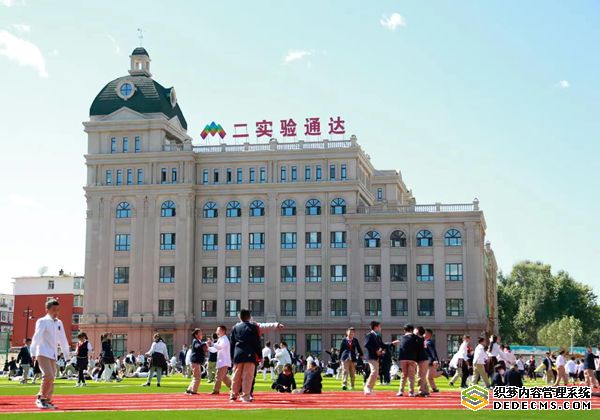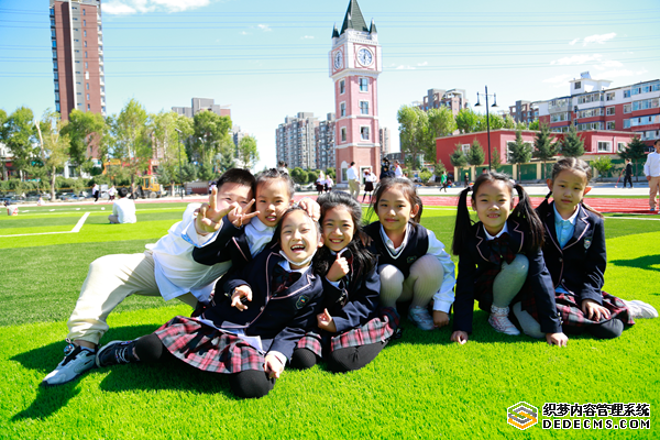 图为:长春市通达小学校园,孩子们身后背景就是“梦想钟楼”