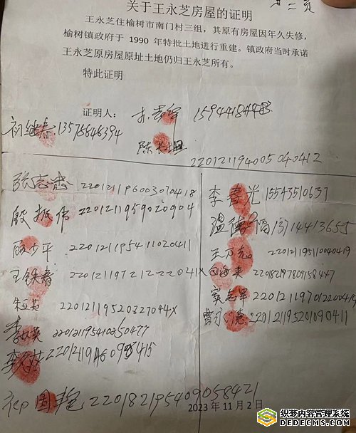 在南门村三组,记者跟随王永林来到他家的原有宅基地,一眼望去,这块宅基地不大,也只有一亩多大,早已经变成了耕地。记者随机采访了几位村民,村民们向记者证实:王永芝原有的房屋是1990年重建的,当时因为房子处于低洼地被水侵泡,成了危房,镇政府决定,特批给他一块宅基地,让他异地重建,并承诺原有的宅基地作为机动地仍归王永芝所有。王永芝搬离后,邻居时(音)姓人家就将此处宅基地种上庄稼,后来就租给了村里会计、队长吴老七(吴万福)。这期间,王永芝和父母相继离世,王永芝的本家弟弟王永林就开始找时(音)姓人家索要老宅的宅基地,但至今未果。采访中,一些村民还写了证明材料并在证明材料上签字、按上手印。