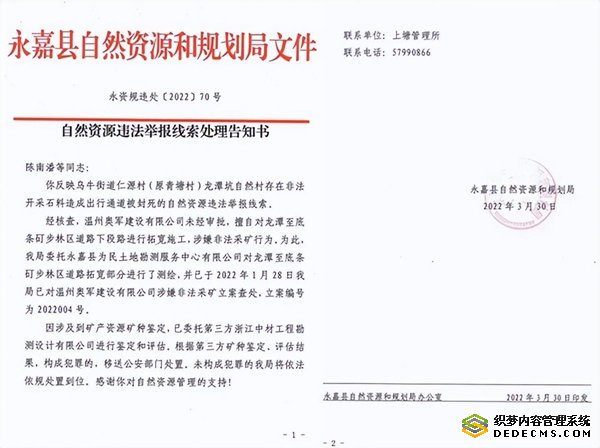 至今,我们举报此事已长达3个年头,期间,永嘉县自然资源和规划局于2022年1月28日已经对温州奥军建设涉嫌非法采矿立案查处(立案编号为2022004号);并于同年3月30日发文——永资规违处[2022]70号《自然资源违法举报线索处理告知书》(简称为《告知书》)。