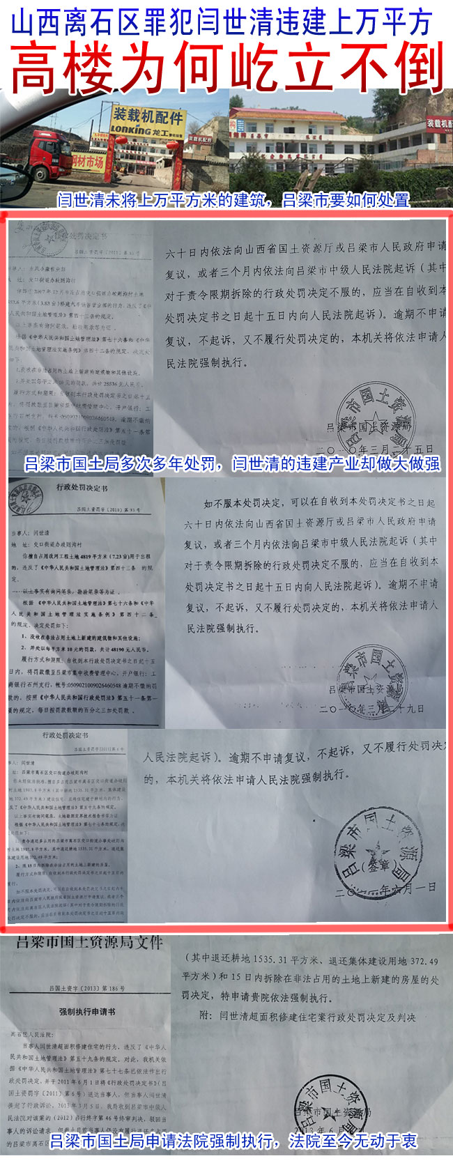 离石区法院不理会国土局强制申请,罪犯闫世清不把吕梁市委书记放在眼中,身为村霸和罪犯的闫世清到底有多大能量,他的违章大楼何时按照强制执行申请书被离石区法院强制拆除,全国网友在拭目以待。