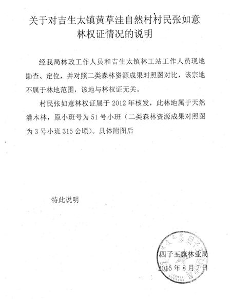 在们坚持不懈的努力下,2015年5月23日上午,四子王旗林业局终于作出反应,该局责成吉生太林工站站长张某某、吉生太镇政府司法所所长崔某等人员实地 调查此事,当时一同前往现场者还有两名参与采访此事的媒体记者。经过一系列现场勘察、定位、GPS比对,林工站的负责人张站长当时对在场的所有人表态说, 被毁坏的林地权属于我的林地范围,并肯定地说该片土地是属于林地(有当时现场录音与在场人员口述为证)。令人莫名其妙的是,就在当天下午,四子王旗林业局 副局长梁某、森林公安局某负责人等两名工作人员对这片被毁坏且改变了用途的林地再次进行了复勘。勘察结束后,梁副局长对现场所有人宣布,说我林权证上所标 注的林地不在这块有争议的耕地上,并说按照他们得到的数据定位显示,我林权证上所标注的林地在东面那座看不到任何树木的荒山秃岭上。我对梁副局长这个风马 牛不相及的答复,气的欲哭无泪,当即问道:“上午张站长明明说这片地是林地,是属于我林权证标注范围,怎么一下子就变了呢?再说东面那个荒坡上从来不长树 木,我的林地怎么会一下子跑到哪里去呢?你们当初难道会给那些不长树木的荒坡发《林权证》吗?”梁副局长答复到:“东面那个大约4000亩的山坡上,虽然 不长树木,但那就是林地,国家以后还要给补贴钱款呢,你们手里的那个《林权证》实际是个荒坡证。”(当时的对话均有录音为证)接下来,四子王旗林业局就不 顾事实真相,在2015年8月7日下午签发了一份掩盖事实真相的证明文书(《关于对吉生太镇黄草洼自然村村民张如意林权证情况的说明》)。该证明文书称: