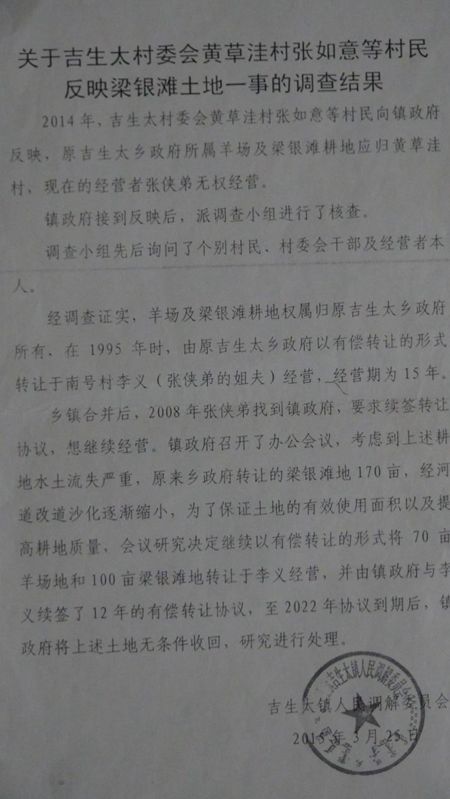 请看《关于吉生太村委会黄草洼村张如义等村民反映梁银滩土地一事的调查结果》: