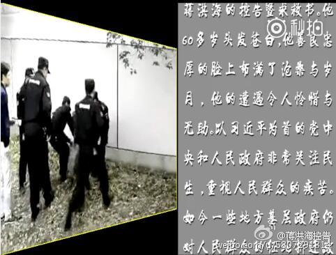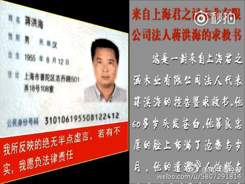 发稿人:蒋洪海,手机13501739375 身份证号是:310106195508122412,我所反映的绝无半点虚言,若有不实,我愿负法律责任。 原标题:上海君之涵木业有限公司法人代表蒋洪海的控告暨求救书 这是一封来自上海君之涵木业有限公司法人代表蒋洪海的控告暨求救书。他60多岁头发花白,他善良忠厚的脸上布满了沧桑与岁月,他的遭遇令人怜惜与无助。以习近平为首的党中央和人民政府非常关注民生,重视人民群众的疾苦。如今一些地方基层政府仍对人民群众的征地拆迁政策违规执行,涉嫌违法强拆,给人民群众造成重大经济损失,导致社会新的不和谐和不稳定因素。下面请听来自当事人蒋洪海的实录声音吧! 蒋洪海的实录声音 转载视频地址:http://player.56.com/v_MTM5OTM3NzMw.swf
