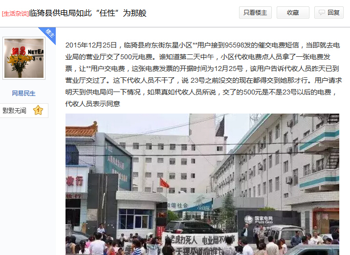 用 户至今不明白,临猗供电局发了催交电费通知后,自己马上就到营业点交了费,按说这是一查就清楚的事,为何又出现二次催费的事,更可气的是,同样的电费,为 何只能往代收人员手上交,这里面难道啥猫腻不成?况且电费已经交过,供电局咋就这般的任性,想停电就停电,这“电老虎”的作风啥时才能改改?