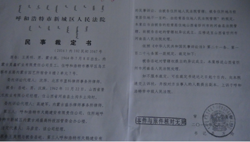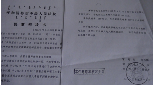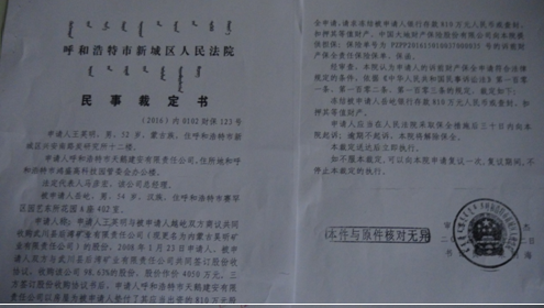 2013年5月17日,我收到呼市中院的判决书后,依法上诉到内蒙古自治区高级人民法院。高院的终审判决很快下来了,彻底纠正了呼市中院的错误判决,责令王英明在判决生效后十日内给付我股权转让款、违约金共计1111万元。王英明对高院判决不服,申请再审被驳回,于是又申请监督程序。内蒙古检察院向最高人民检察院提请抗诉,最高人民检察院下达了不支持监督申请的决定书。王英明又启动内蒙古自治区人大常委会即内务司法委员会执行监督,被呼和浩特市中级人民法院再次驳回,其又向内蒙古高级人民法院申请复议,再次开庭被驳回。