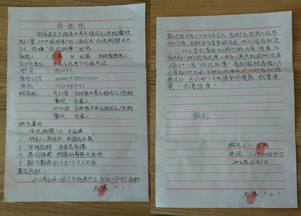 以上是我举报和控告的内容,请省、市有关部门的领导依照《中华人民共和国刑法》第二百三十八条“非法拘禁”罪制裁被举报人马红星和叶长国,不能让法律系统内的罪犯逍遥法外!还我那7天所遭受的冤屈,我要申冤!我要追责!