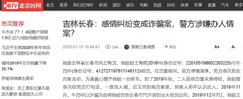 我是吉林省长春市民王海龙,我姐姐王海艳2018年(身份证号:220105198602263225)与牛乃华(身份证号:412727197611146112)相恋。在恋爱期间,双方感情深厚,男方多次到女方家走动,为表真心赠予我姐一台轿车。到了2019年秋,二人因故恋爱关系终结,我姐曾多次给男方打电话,一直没人接,后又找到南方家里,其家人称不认识此人。2019年11月,牛乃华以诈骗为由将我姐告到长春市汽开区创业大街派出所。2019年12月7日,我姐王海艳来到创业大街派出所说明情况,派出所经过审查,认为车与钱均是男方自愿赠与,此事争议属于男女双方感情纠纷问题,够不上刑事案件,因此不予立案。