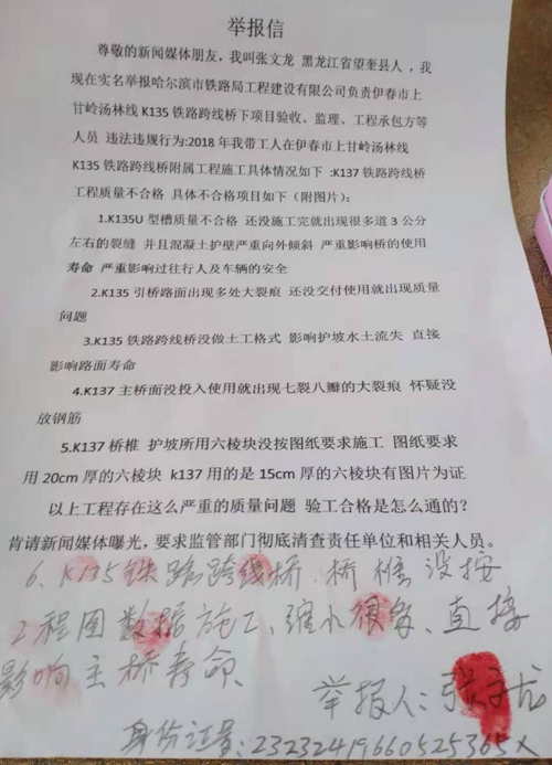 我叫张文龙,黑龙江望奎县人,现在实名举报哈尔滨市铁路局工程建设有限公司负贵伊春市上甘岭汤林线K135铁路跨线桥下项目验收、监理、工程承包方等人员违法违规行为。