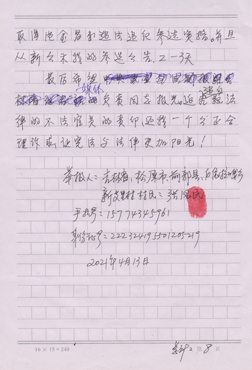 我要求上级调查核实后,立即恢复我本人的参选资格,并且重新公示,并追究违法官员的责任,还我一个公正。