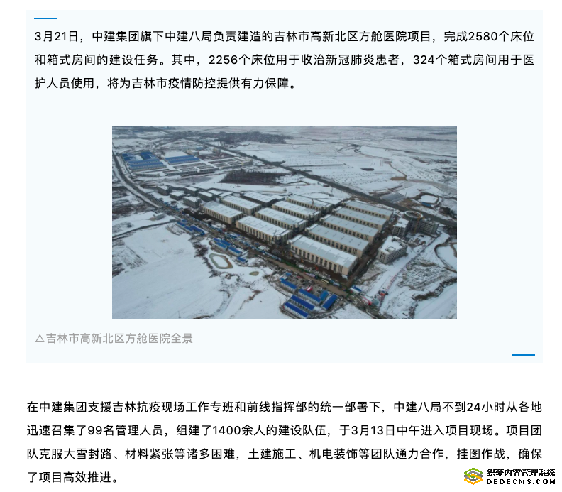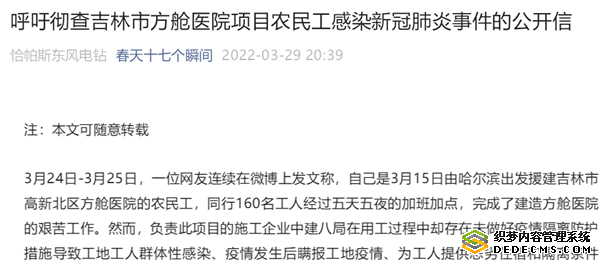 3月24日-3月25日,一位网友连续在微博上发文称,自己是3月15日由哈尔滨出发援建吉林市高新北区方舱医院的农民工,同行160名工人经过五天五夜的加班加点,完成了建造方舱医院的艰苦工作。然而,负责此项目的施工企业中建八局在用工过程中却存在未做好疫情隔离防护措施导致工地工人群体性感染、疫情发生后瞒报工地疫情、为工人提供恶劣住宿和隔离条件(宿舍拥挤且缺电失温)、不按承诺为工人支付隔离费、拖欠农民工工资等诸多严重问题。