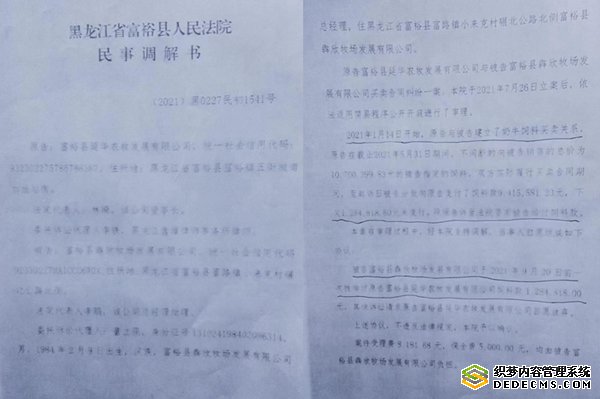 截止2021年5月31日,富裕县犇欣牧场发展有限公司(以下简称发展公司)欠富裕县延华农牧发展有限公司(以下简称:延华公司)饲料款本金128万元以上,延华公司于2021年6月对发展公司提起诉讼,同时,对发展公司在蒙牛乳业(齐齐哈尔)有限公司的奶款进行了诉讼保全。后经富裕县人民法院民事调解,双方成功达成调解意见,富裕县人民法院于2021年8月25日下达民事调解书(调解书文号【2021】黑0227民初1541号)。