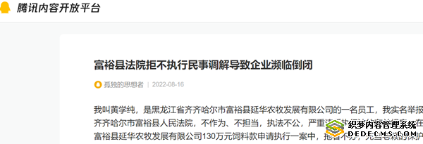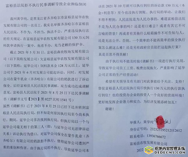 我叫黄学纯,是黑龙江省齐齐哈尔市富裕县延华农牧发展有限公司的一名员工,我实名举报齐齐哈尔市富裕县人民法院,不作为、不担当,执法不公,严重违反执行法的有关规定,在富裕县延华农牧发展有限公司130万元饲料款申请执行一案中,拖着不办,充当老赖的保护伞。