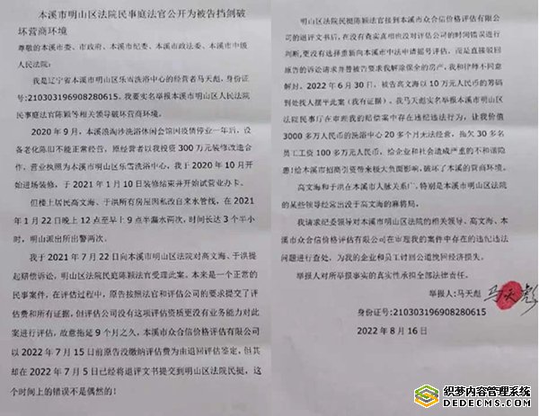 我是辽宁省本溪市明山区乐雪洗浴中心的经营者马天彪,身份证号:210303196908280615。我要实名举报本溪市明山区人民法院民事庭法官陈颖等相关领导破坏营商环境。