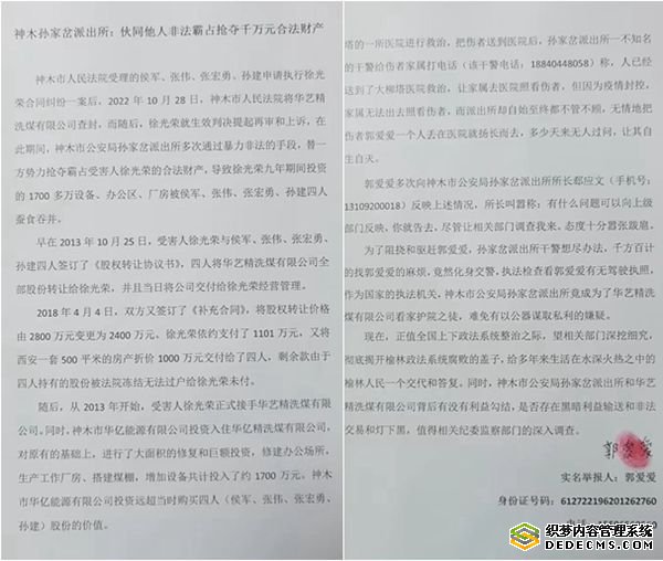 陕西省神木市人民法院受理的侯军、张伟、张宏勇、孙建申请执行徐光荣合同纠纷一案后,2022年10月28日,神木市人民法院将华艺精洗煤有限公司查封,而随后,徐光荣就生效判决提起再审和上诉,在此期间,神木市公安局孙家岔派出所多次通过暴力非法的手段,替一方势力抢夺霸占受害人徐光荣的合法财产,导致徐光荣九年期间投资的1700多万设备、办公区、厂房被侯军、张伟、张宏勇、孙建四人蚕食吞并。