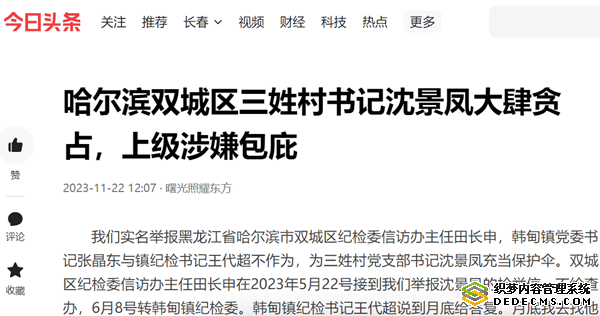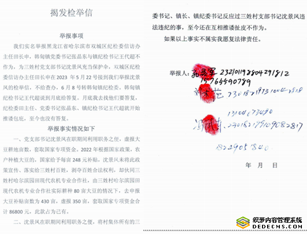对于沈景凤的以上问题,我们曾多次到双城区纪检委田长申主任、韩甸镇党委书记、镇长、镇纪委书记处反应,但这些人至今还在互相推诿扯皮不作为。