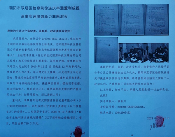 我是强新力,身份证号210304196501261216。我实名控告朝阳市双塔区检察院原科长徐连庆、沈阳国源科技发展有限公司董事长董利成(现北京世纪国源科技发展有限公司董事长)、总经理李景艳(现北京世纪国源科技发展有限公司总经理)相互勾结捏造犯罪事实、诬陷我受贿,致使朝阳市双塔区人民法院于2010年12月15日做出12年刑事判决,使我蒙受不白之冤,身心遭受巨大摧残,心灵创伤至今无法治愈,恳请纪检监察领导严肃查处徐连庆、董利成恶意串通、采取刑讯逼供的残忍手段、掩盖事实真相、捏造犯罪证据、非法诬陷他人、扰乱司法公正、致使审判机关错判的严重违纪违法行为!扫除恶势力,还以清朗人间!