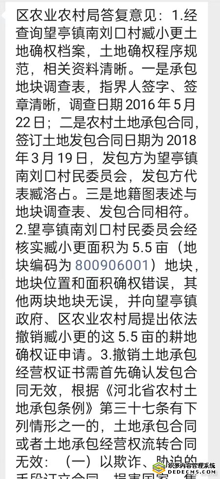 南刘口村委会为黑掉我土地补偿款可谓心机用尽,除了操纵臧老甫做虚假证明外,还向清苑区农业农村局提出注销本人土地确权证的申请。好在清苑区农业农村局领导原则性强、业务水平高、颇富担当精神,并实事求是地对确权证一事给出明确答复:1.经查询望亭镇南刘口村臧小更土地确权档案,土地确权程序规范,相关资料清晰。一是承包地块调查表,指界人签字、签章清晰,调查日期2016年5月22日;二是农村土地承包合同,签订土地发包合同日期为2018年3月19日,发包方为望亭镇南刘口村民委员会,发包方代表臧洛占。三是地籍图表述与地块调查表、发包合同相符。清苑区农业农村局权威认定本人的确权证真实有效,不存在任何问题。由此可见,既然土地确权证真实有效没有任何问题,那么不言而喻,南刘口村委会定然是造假的始作俑者了。