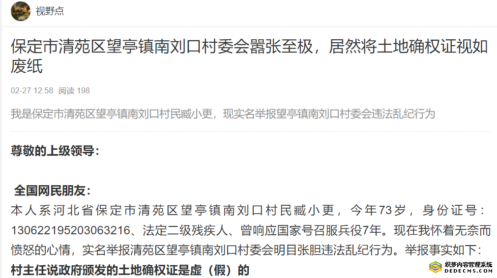 可见,保定市清苑区望亭镇政府及南刘口村委会压根就没把国家政策法规当回事。镇政府在向上级汇报情况时,居然谎称“镇党委对此事非常重视,已经多次与臧小更沟通妥善解决”。这不是睁着眼睛说瞎话吗?事实上,自打那个驻村干部在12345电话中对我出言不逊后,至今一年已过,本人从未接到过镇政府和村委会任何电话,何来的妥善沟通解决?倒是我和家人在此期间,分别给镇政府及村委会打过几次电话,镇政府没有如何答复,村主任的答复仍然是:“那个确权证是虚(假)的,没有一点用,征地补偿不会有”