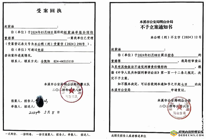 2024年5月13日,对于孙绍钧诈骗罪、重婚罪,本溪市公安局明山分局刑警队受理了案件,2024年6月7日,诈骗罪正式立案,并且做了详细笔录。2024年6月7日,刑警队对孙绍钧诈骗案,开始立案侦查。2024年8月5日,赵紫涵向明山分局办理案件某警官打电话追问案件结果,明山分局回复案件正在推进。