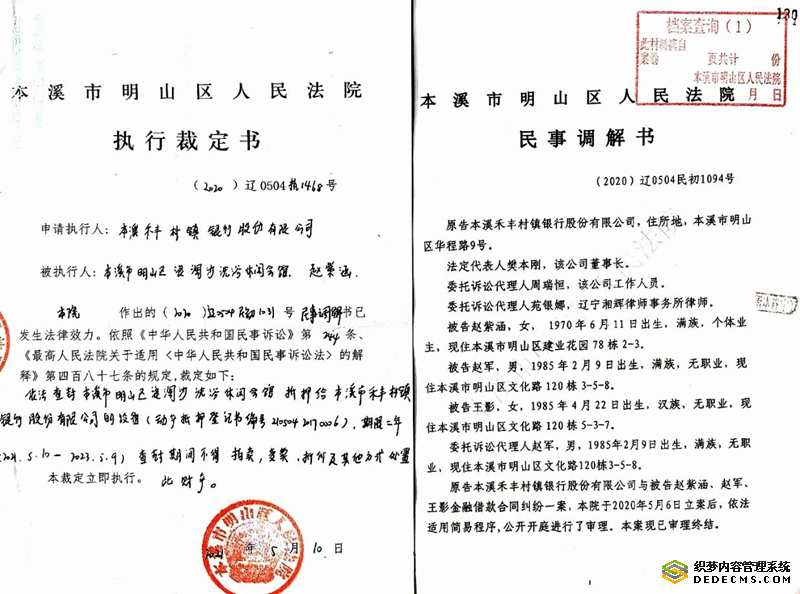 2022年11月19日,赵紫涵接到明山区法院的执行裁定书,马上联系明山法院执行局的法官曲靖武(法院的法警),询问是什么情况,为什么拍卖两次都不通知赵紫涵及其代理人并且流拍了还以物抵债呢?更恶劣的是两处房产、两个抵押分别是600万和498万,而明山法院执行局却让本溪禾丰村镇银行以749.532万元的价格将两处房产以物抵债,却只清了一笔498万的贷款,那笔600万的贷款没清而抵押房产却不翼而飞了,这是银行、法院、律师、拍卖公司弄虚作假、违纪、违法的典型案例。