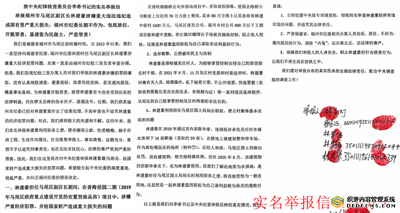 本站讯 近日,福建省福州市马尾区琅岐镇多名村民向中央纪委提交实名举报材料,直指该区副区长林建豪在任职期间涉嫌滥用职权、侵吞国有资产、收受贿赂等多项重大违法违纪行为,造成国有资产巨额损失。举报人感到更加令人愤慨的是,他们曾经多次举报,但是福州市纪委相关办案部门长期不作为、刻意包庇,导致林建豪至今未受到应有的法律制裁,其仍持续实施打击报复行为。