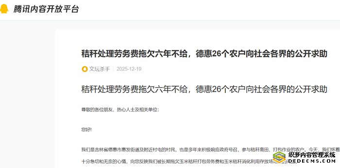 秸秆处理劳务费拖欠六年不给,德惠26个农户向社会各界的公开求助