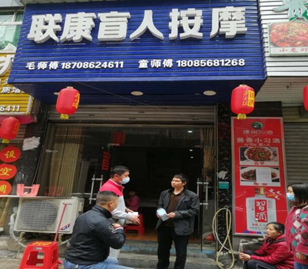 图为碧江区残联副理事吕宁在盲人按摩店指导复工复产工作.