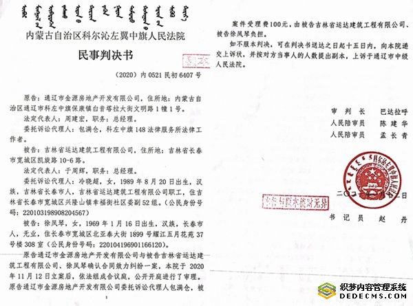 到2018年10月1日,吉地华府小区完工,但金源地产没有按合同约定履行给付义务,却屡屡在工程造价上做文章,竟想以收尾工程每平米1600的造价结算工程,于是双方产生纠纷。为了解决问题,科左中旗政法委书记莫日根巴特尔,要求双方到其办公室谈判。据徐凤琴介绍,该书记倾向每平米1600元,徐凤琴不认可,莫书记则明确表态,你们如果不认可我的意见,可以通过法院诉讼解决,结果在科左中旗法院引发了一场诉讼。第一次诉讼,2020年10月份,金源地产在科左中旗法院起诉徐凤琴工程单价每平米1600元。在法院开庭时,开发商未到庭参加诉讼,科左中旗法院下达了(2020)内0521民初996号民裁定书,按原告金源地产自动撤诉处理。开发商又提起第二次诉讼,诉讼请求与前诉相同,开庭时,徐凤琴向科左中旗法院提供了通辽市中级人民法院(2019)内05民初20号民事判决书,该判决书在法院认定事实部分认定了工程单价每平米1700元。可是科左中旗法院法官巴达拉呼罔顾事实,公然对抗上级法院判决,悍然下达了(2020)内0521民初6407民事判决书,判决工程单价每平米1600元,做出这一判决的法官正是法官巴达拉呼。令人感到怪异的是,这份判决书下达后并没有给徐凤琴送达。徐凤琴因此怀疑,在此次诉讼的幕后,疑似有一只黑手操纵。