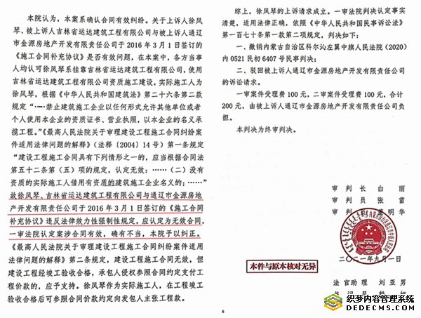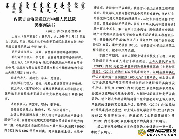 徐凤琴上诉后,通辽中院经过开庭审理,在先后做出(2019)内05民初20号民事判决书、(2019)内民终605号民事裁定书后,2021年9月1日,又做出(2021)内05民终2190号民事判决书,依据双方签订的合同和相关法规,判决认定案涉工程造价按照每平米1700元计算单价,再次坚决次纠正了科左中旗法院关于吉地华府工程承包单价的违法判决!做出这一公正判决法官的名字是审判长白丽、审判员张雷、董明华,这一公正判决,为徐凤琴直接挽回损失800万元!