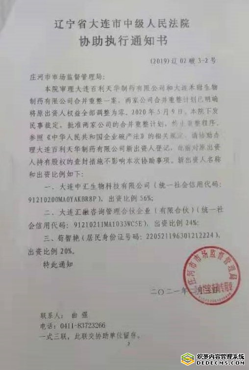 2021年2月3日,大连中院作出(2019)辽02破3-2号协助执行通知书,称“百利公司和禾甜公司合并重整一案,重整计划将原出资人权益调整为零。2020年5月9日,本院下发民事裁定,批准两家公司的合并重整计划”,要求庄河市市场监督管理局协助将百利公司的出资人变更为大连中汇生物科技有限公司(以下简称“中汇公司”)、大连汇融咨询管理合伙企业(有限合伙)(以下简称“汇融咨询”)和荀**,并称“此前对原出资人持有股权的查封措施不影响本次协助事项”。
