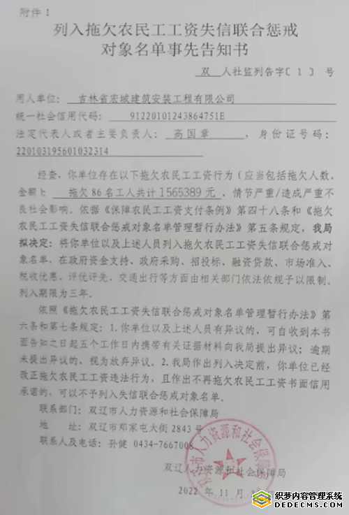 2022年12月12日,宏城长春分公司接到双辽市人社局作出的《列入拖欠农民工工资失信联合惩戒对象名单事先告知书》,告知书称,依据《保障农民工工资支付条例》第四十八条和《拖欠农民工工资失信联合惩戒对象名单管理暂行办法》第五条规定,我局拟决定:将你单位以及上述人员列入拖欠农民工工资失信联合惩戒对象名单,在政府资金支持、政府采购、招投标、融资贷款、市场准入、税收优惠、评优评先、交通出行等方面由相关部门依法依规予以限制,列入期限为三年。