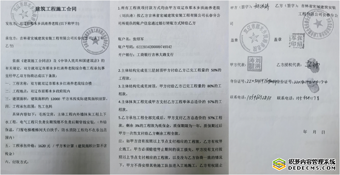 本站讯 吉林省双辽市一养老院筹建综合楼公开对外发包,吉林省一企业与其签订施工合同,合同明确约定了“承包范围”和“付款方式”,然而,直到工程进入三层封顶阶段,建设单位也没有履约付款,承包单位在垫付数百万资金情况下方知被骗,当施工方带着农民工找到建设单位要求支付农民工资时,建设单位法人两手一摊表示“要钱没有,要命一条”。