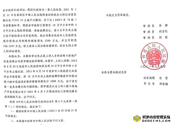 但令人感到不可思议的是,此案由松原中院和吉林省高院审理后,却出现了惊天的反转,一二审法官对扶余市政府已经实际弥补了德卡公司800万元的限价损失的事实出尔反尔,不予认定,仍以重复诉讼和超过最长起诉期限为由驳回德卡公司的起诉,导致本案“案结事未了,程序空转”。德卡公司认为,由于两级法院法官的枉法裁判,导致其正当诉求没有得以解决,给其造成1200万的经济损失。