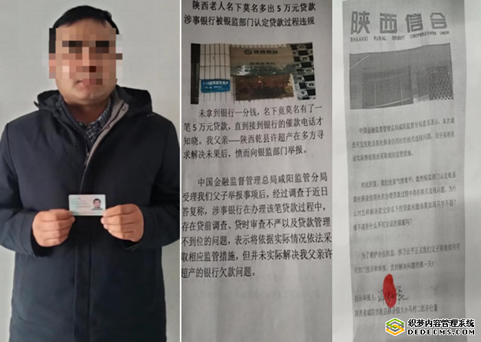 未拿到银行一分钱,名下竟莫名有了一笔5万元贷款,直到接到银行的催款电话才知晓。我父亲-----陕西乾县许超产在多方寻求解决未果后,愤而向银监部门举报。