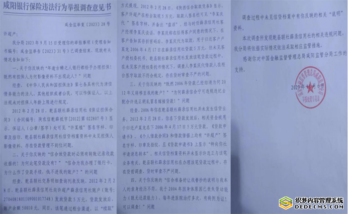 中国金融监督管理总局咸阳监管分局受理我们父子举报事项后,经过调查于近日答复称,涉事银行在办理该笔贷款过程中,存在贷前调查、贷时审查不严以及贷款管理不到位的问题,表示将依据实际情况依法采取相应监管措施,但并未实际解决我父亲许超产的银行欠款问题。