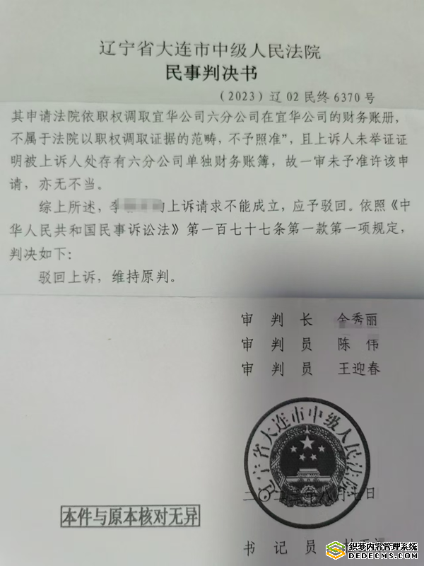 李先生说,这次甘井子区法院的判决,全以一句“驳回原告全部诉讼请求”而判定此事,他不服,又上诉到大连市中级法院。这一次李先生申请法院调取他在宜华的财务账册,宜华只要拿出财务账册,所有的款项都清楚了,可是法院说“不属于法院依职权调取证据的范畴,不予照准”,大连中院同样用一句“驳回上诉维持原判”来了结这起官司。