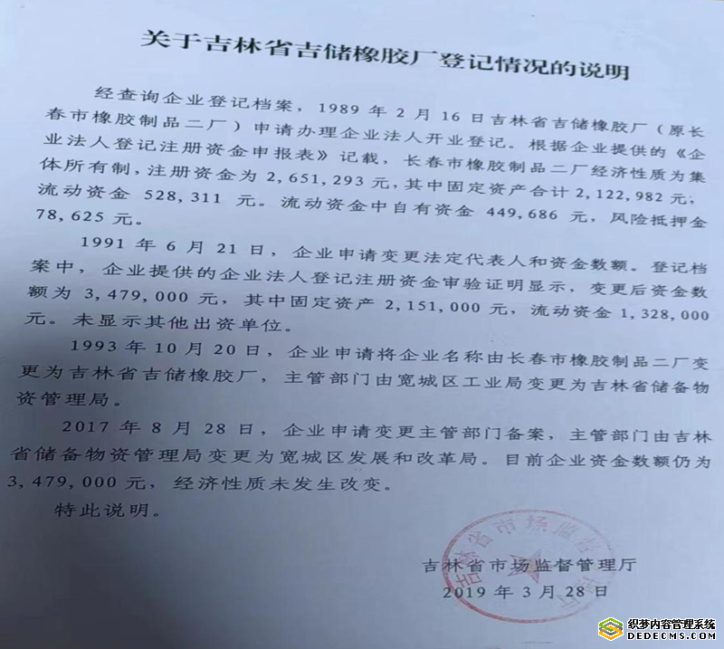 记者从橡胶厂职工们处看到一份吉林省市场监督管理厅于2019年3月28日出具的《关于吉林省吉储橡胶厂登记情况的说明》。该说明称:“经查询企业登记档案,1989年2月16日,吉林省吉储橡胶厂(原长春市橡胶制品二厂)申请办理企业法人开业登记。根据企业提供的《企业法人登记注册资金申报表》记载,长春市橡胶制品二厂经济性质为集体所有制,注册资金为2,651,293元,其中固定资产合计2,122,982元,流动资金528,311元。流动资金中自有资金449,686元,风险抵押金78,625元。1991年6月21日,企业申请变更法定代表人和资金数额。登记档案中,企业提供的企业法人登记注册资金审验证明显示,变更后资金数额为3,479,000元,其中固定资产2,151,000元,流动资金1,328,000元。未显示其他出资单位。1993年10月20日,企业申请将企业名称由长春市橡胶制品二厂变更为吉林省吉储橡胶厂,主管部门由宽城区工业局变更为吉林省储备物资管理局。2017年8月28日,企业申请变更主管部门备案,主管部门由吉林省储备物资管理局变更为宽城区发展和改革局。目前企业资金数额仍为3,479,000元,经济性质未发生改变。”