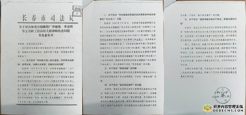 长春市司法局在关于对吉林省吉储橡胶厂五名职工投诉田大原律师职业问题的答复意见书中说:经查明,2019年6月18日,吉林省吉储橡胶厂(以下简称吉储橡胶厂)、长春市宽城区发改局(以下简称宽城区发改局)和吉林衡丰律师事务所(以下简称衡丰律师所)签订的《委托代理合同》[(2019)吉衡总民字第1052号],由吉储橡胶厂和宽城区发改局共同委托衡丰律师所代理与陈广田等无权占有纠纷并要求无权占有人依法返还吉储橡胶厂土地、房屋、经营权等全部财产一案。本案中衡丰律师所受吉储橡胶厂委托,被代理人是吉储橡胶厂,而非刘影,不存在被代理人身份虚假问题。这份答复意见中出现了:“经查明,宽城区发改局证实田大原律师在庭前会议中出具的录音录像及照片皆由该局提供.....”“经查明,宽城区发改局证实田大原律师在庭前会议中陈述代理意见及代理权限均来源于该局及刘影,不存在“缺乏职业操守的问题。“经查明,宽城区发改局证实田大原律师在庭前会议中发表的“推荐刘影为新的法定代表人的签名宽城区发改局经过甄别,合法有效”的代理意见来源于该局和刘影,该代理意见是否被采纳,由法院做出裁判,不能认定有欺骗法庭的行为。”
