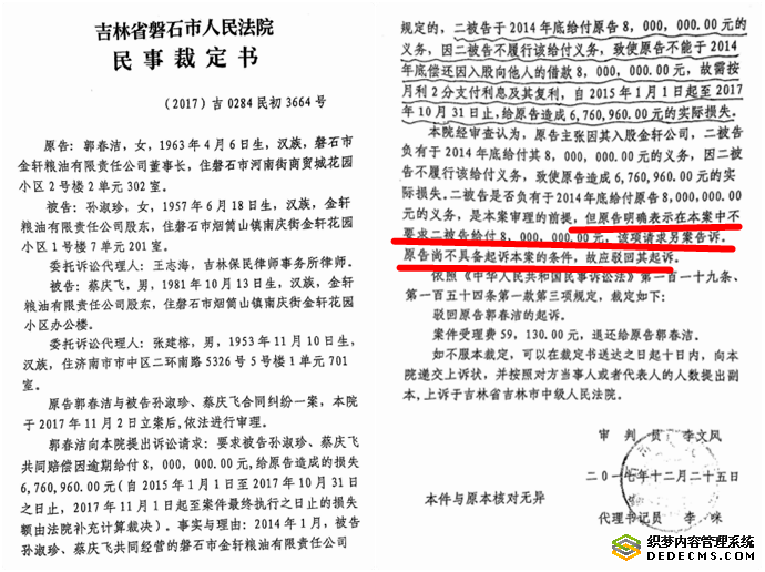孙淑珍向媒体介绍:本案一审、二审庭审时,孙淑珍、蔡庆飞母子提供的证据可证明从2014年至2016年郭春洁个人与金轩公司的借款金额为27674506.00元,利息转本金1113742元,金轩公司累计向其支付本息共计28788248元。仅2014年,公司向郭春洁支付本息总额已达20027186元之多,可证明因实际履行已经对该《协议书》第四条的约定进行了实质性变更,该条款约定的双方为公司“经营借款”未实际产生,但一、二审法院均未要求郭春洁对此证据进行质证,未查清事实。假设此“经营借款”如吉林中院认定的那样是“利润分配”,那么直至现在金轩公司帐面仍有现金数百万元,郭春洁与其哥哥一直管理经营公司各项业务,没有理由不将此款项转出,不可能时隔三年才主张权利。如若公司存在欠付郭春洁的800万元,更不可能在公司帐目上没有任何体现。