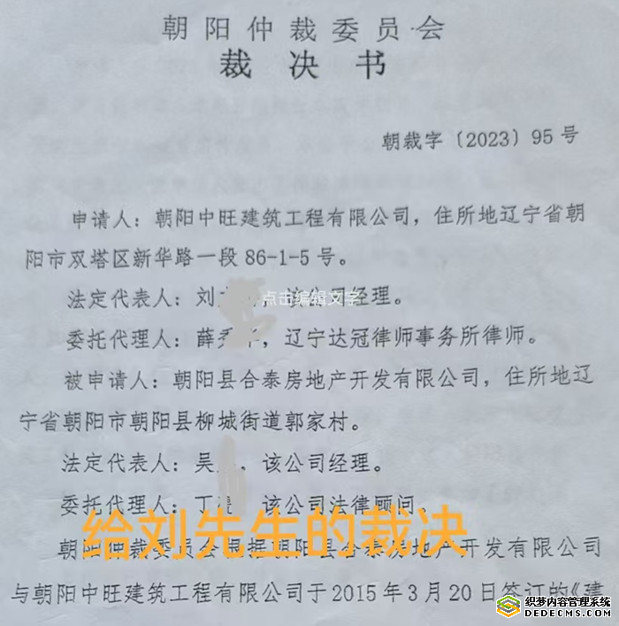 时间回溯到十年前的 2014 年春天,周先生与朝阳市的“朝阳县合泰房地产开发有限公司”签订了建筑施工合同,合同中约定,若有纠纷可通过仲裁解决,这原本是为双方矛盾化解铺设的一条法治轨道。两年多后,周先生将验收合格的工程交付给合泰公司,然而,又三年的时光悄然流逝,工程的部分尾款却如石沉大海,迟迟未到账。周先生无奈之下,来到朝阳市仲裁委员会寻求公正。