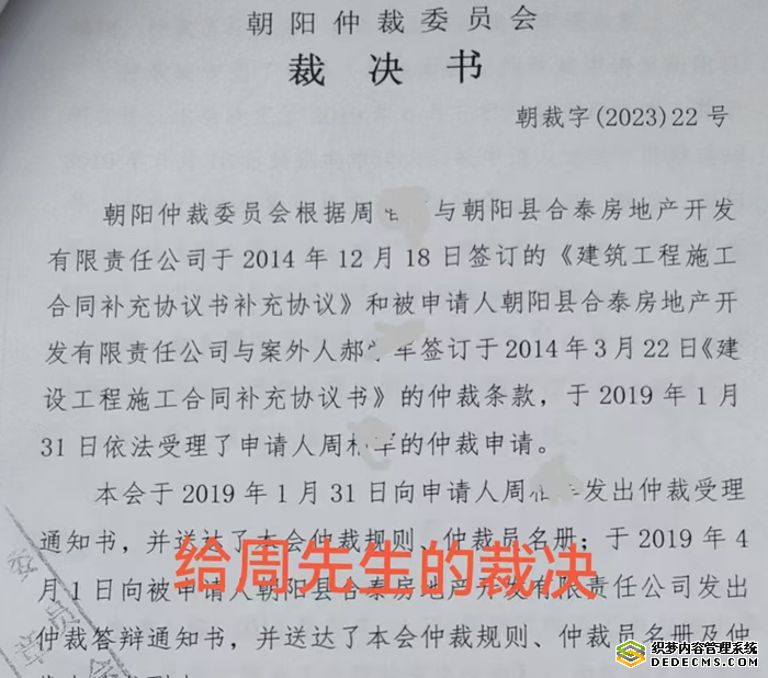 周先生委屈又愤怒地表示,合泰开发的小区,从头到尾他都在现场挥汗如雨地干活,根本就没有见到刘先生的公司在此施工。他有充分的证据证明,刘先生拿到仲裁委的施工合同及欠款等所谓的证据,全是后来编造出来的,就像一场精心策划的骗局。说白了,刘先生与开发方合泰是一伙的,他们这样做的目的,就是想为开发商赖回点钱。然而,朝阳市仲裁委却像一个闭目塞听的巨人,既不去调查,也不去核实,罔顾事实,枉法给刘先生下达了这样一份裁定。