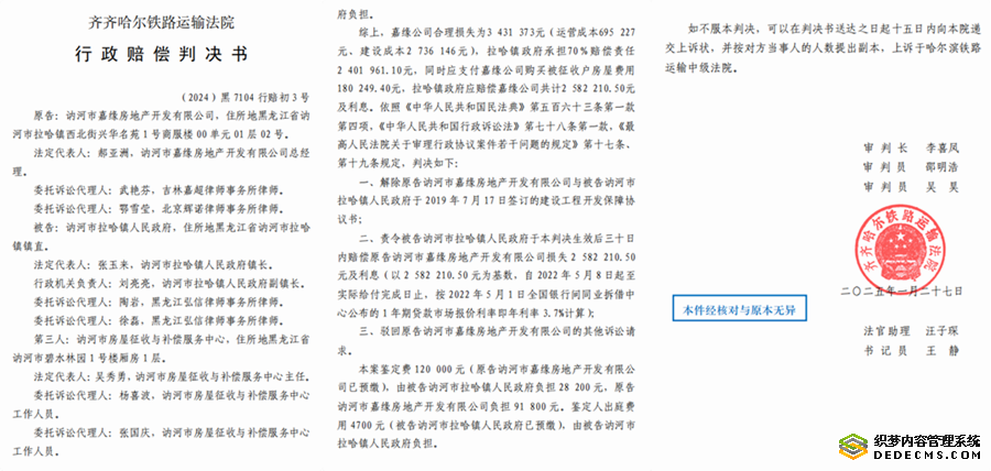 嘉缘公司的维权之路首先在行政诉讼中取得突破。2022年,齐齐哈尔铁路运输法院作出(2022)黑7104行初280号判决,认定拉哈镇政府终止协议的行政行为违法;2023年,二审法院维持原判,明确镇政府“单方面解除协议缺乏事实和法律依据”。