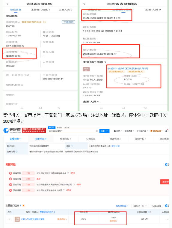 该说明称:“经查询企业登记档案,1989年2月16日,吉林省吉储橡胶厂(原长春市橡胶制品二厂)申请办理企业法人开业登记。根据企业提供的《企业法人登记注册资金申报表》记载:“长春市橡胶制品二厂经济性质为集体所有制,注册资金为2,651,293元,其中固定资产合计2,122,982元,流动资金528,311元。流动资金中自有资金449,686元,风险抵押金78,625元。1991年6月21日,企业申请变更法定代表人和资金数额。登记档案中,企业提供的企业法人登记注册资金审验证明显示,变更后资金数额为3,479,000元,其中固定资产2,151,000元,流动资金1,328,000元。未显示其他出资单位。1993年10月20日,企业申请将企业名称由长春市橡胶制品二厂变更为吉林省吉储橡胶厂,主管部门由宽城区工业局变更为吉林省储备物资管理局。