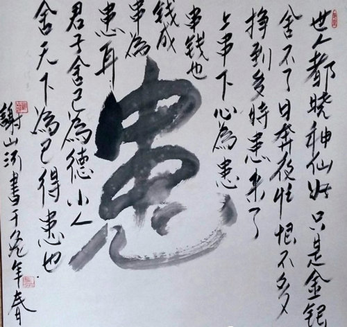 谢山河:是,第四个,叫业力病。我们看一下病患的“患”字是怎么写的,上面一个钱串子的“串”,下面一个“心”,不该得的钱、不该挣的钱、不该要的钱、贪的钱、坑的钱,骗的钱全是黑心钱,是要命的业力病根,别人吃不上,你朱门酒肉臭;别人穿不上,你绫罗绸缎;别人住不上,你房屋百间,这就形成了“业力病”,这种业力病转嫁到你的五脏六腑,使人多病短命,人财两空,人为财死,鸟为食亡啊,所以行善、助人、帮人、爱人是最终极的良丹妙药,治病需要舍,我们把病患的“患”字,去掉一个“钱眼儿”,就是忠心的“忠”字,再去掉一个呢,就是爱心的“心”字,爱心可以治病,可以治己病、治他病、治天下病,有的人病入膏肓都舍不得扔掉一个钱眼儿,病怎么能好呢?所以古人语,不花钱治不好病。治好了病还要行善呀,君子舍己为人,小人舍人为己,望天下无患亦!