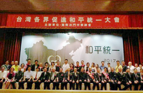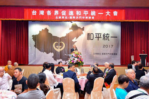 (据中华时报记者:董铁棍报道)近日,国际洪门中华总会在台北隆重召开(台湾各界促进和平统一大会)该会刘沛勋主席主张国家统一是民族复兴最重要的基石。当日与会人士包括新党主席郁慕明,空军备役上将夏瀛洲,中华统一促进党总裁张安乐及佛道、工会、学界、妇女会等各社团代表约500余人出席,大会发表重要宣言,并对和平统一充满了期待。