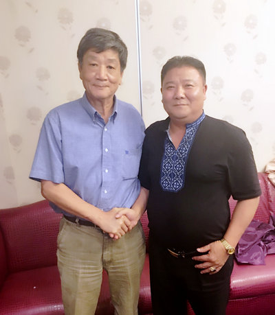 中华统一促进党总裁张安乐与中华时报记者董铁棍在一起交流