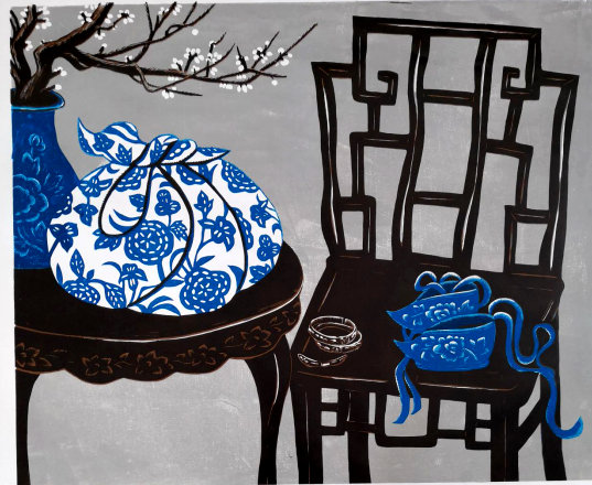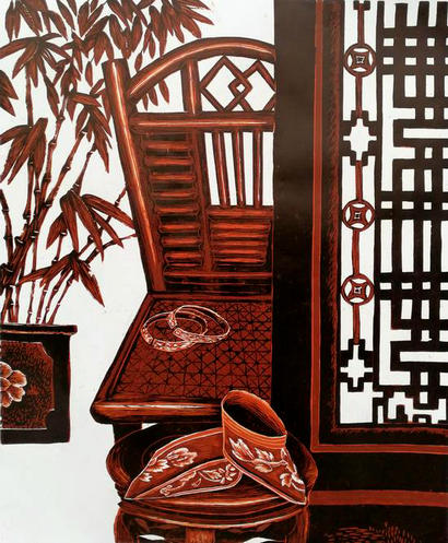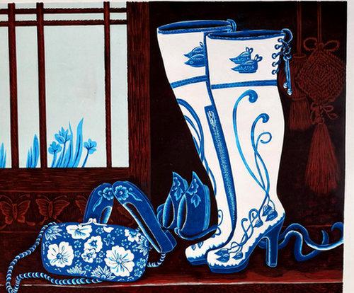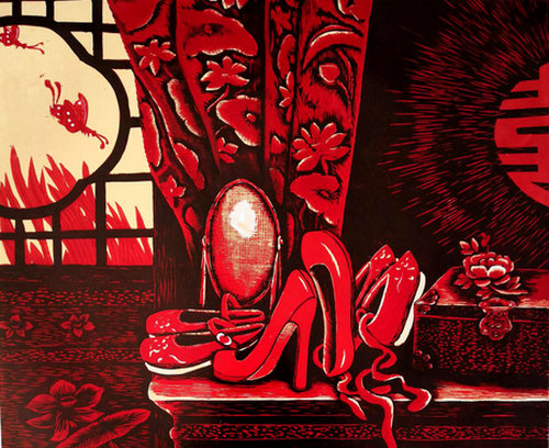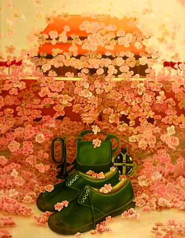 沈春霞的大量绘画作品,不仅表现了过去时代的小脚女人鞋,也以生动的笔触描绘了鲜活的儿童虎头鞋、女性绣花平底鞋、高跟女鞋,以及其他各种现代女人鞋、男人鞋,画出了鞋的变迁史。其作品中展示的东方之美,也让人耳目一新。时下的艺术创作,以如此专注单纯的姿态关注传统题材的人,已经很少见了。沈春霞以纯粹的西方技法来落笔,呈现的却是东方情怀。两者之间的强烈冲突,在她这里,竟是中与西、古与今的完美融合。