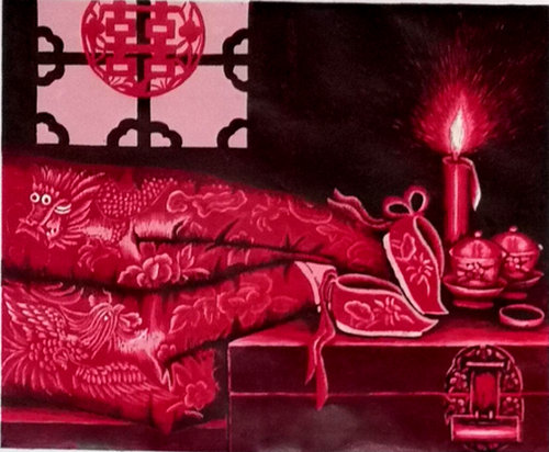 沈春霞版画《配苏轼诗:只恐夜深花睡去,故烧高烛照红妆》