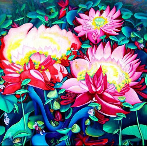 沈春霞油画《万物生》释义:是天上燃烧的火焰 是人间蓬勃的莲 是自由行走的我和你